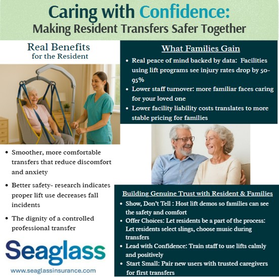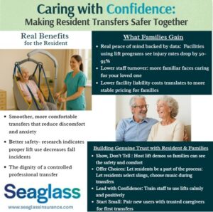 The key to long-term success is making mechanical lifts the standard of care, not an exception. When lifts are positioned as the normal, professional way transfers are done – like taking blood pressure or temperature at the doctor’s office – resistance diminishes. Include lift usage expectations in admission agreements, tour discussions, and care plan meetings from day one.