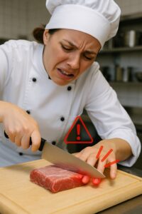 On a Sunday evening, Sarah and her dietary team were preparing beef stew for residents to enjoy during the fall football game. In the rush, Sarah grabbed a dull chef’s knife to cut through partially frozen meat. Because the blade wasn’t sharp, she had to push harder than usual. The knife slipped and cut deeply into her hand, sending her for stitches. Sarah’s injury forced her team scrambling to finish the meal, a situation that sharper tools and correct technique could have prevented.