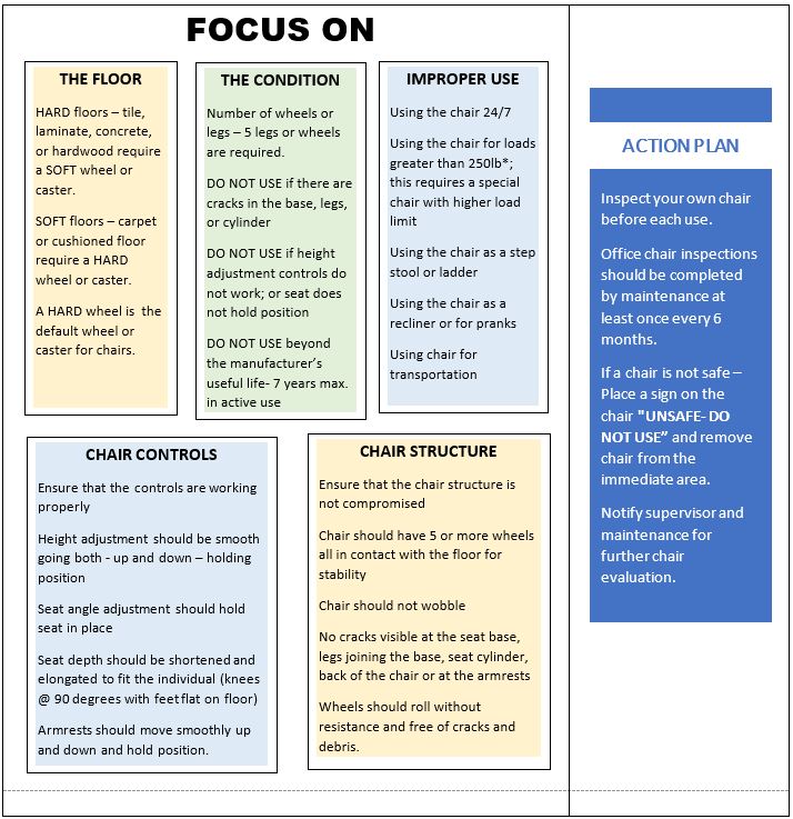 Goldilocks found a chair that was “just right”. How about you? Improper fit or use of office chairs can result in serious injury. The following guidelines can help you find and utilize office chairs safely.